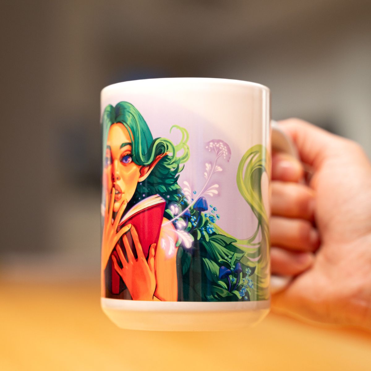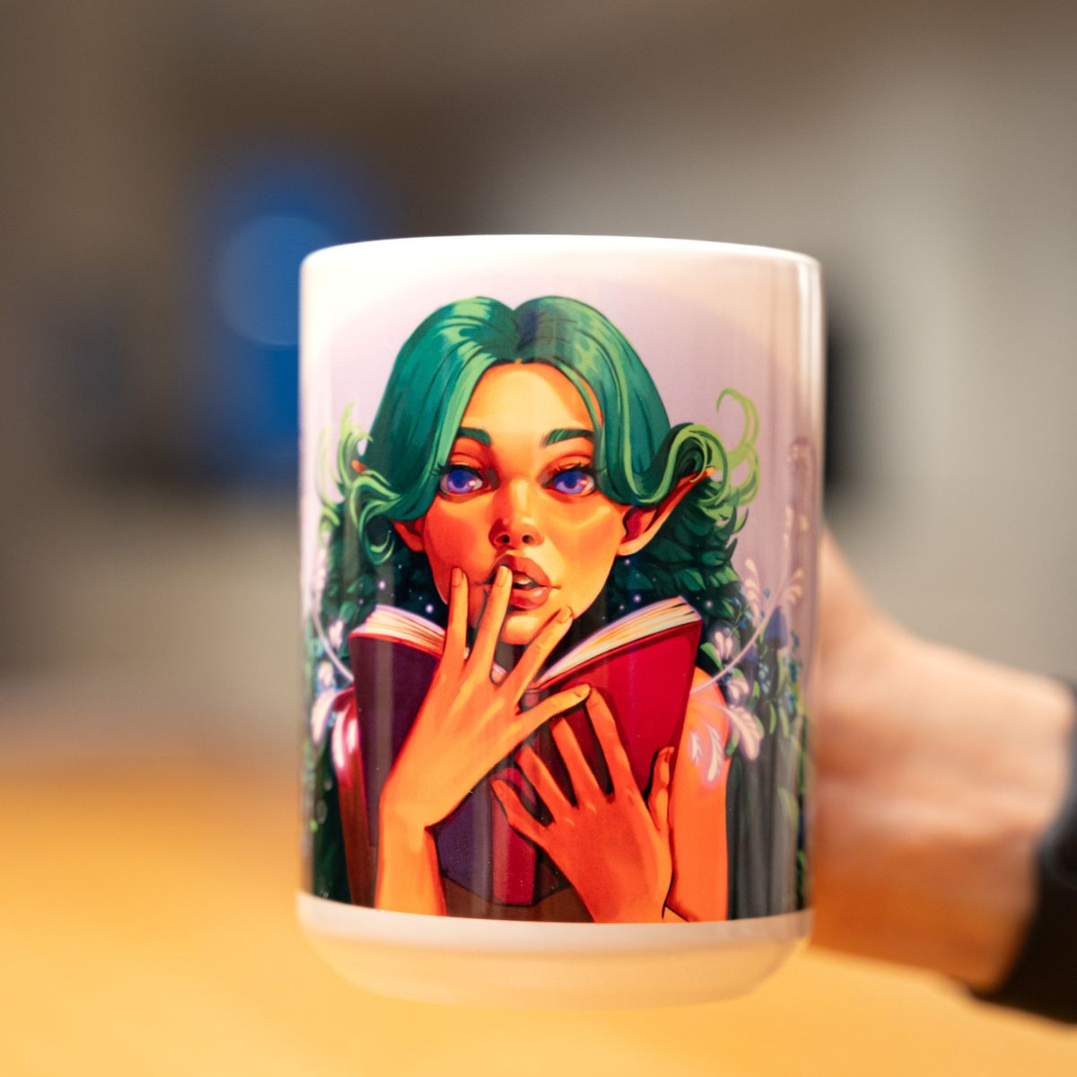 Eteryczna fae o długich, lśniących włosach i magicznym spojrzeniu siedzi pośród kwiatów, zanurzona w lekturze starodawnej księgi. Teraz może być z Toba cały czas, dzięki naszemu kubkowi!